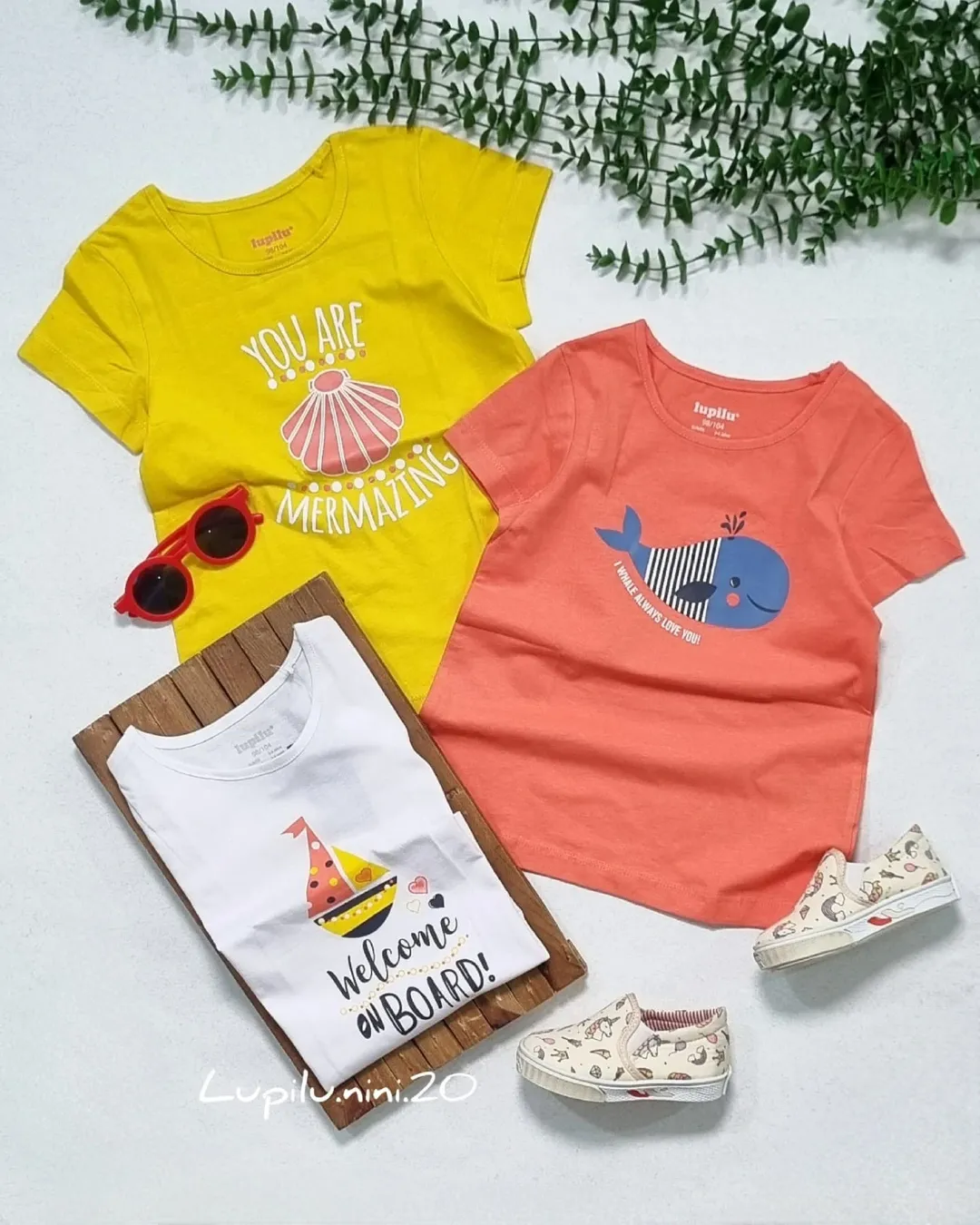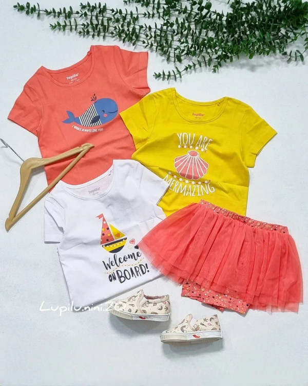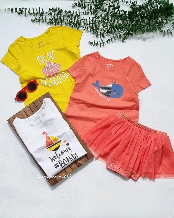 پک ۳ عددی تیشرت دخترانه+شورتک دامنی برند لوپیلو /دارای پک اورجینال جنس تیشرتها نخ پنبه خالص بدون ذره ای مواد جنس دامن توری و شورتک زیری نخ پنبه خالص